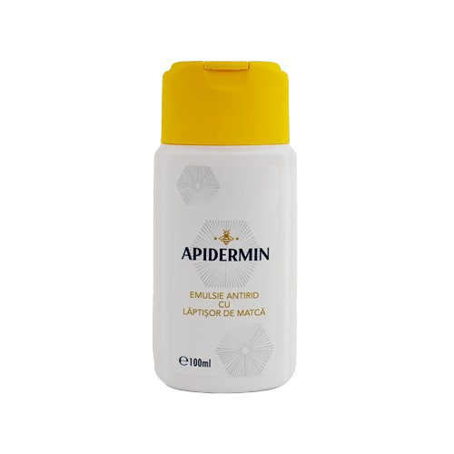 125ml – emulsie antirid cu laptisor de matcaLaptisorul de matca, este una dintre cele mai puternice substante anti-imbatranire naturale. Laptisorul de matca actioneaza la nivel celular, dupa aplicarea lui pielea devenind catifelata. Substanta activa, “laptisorul de matca”, protejeaza pielea impotriva deshidratarii, fiind in acelasi timp un puternic anti-inflamator. Emulsia Apidermin este o emulsie puternic hidratanta cu actiune antirid ce stimuleaza si hraneste pielea, putand fi folosita atat ca demachiant inaintea lotiunii Apidermin dar ca si ca emulsie hranitoare. 125ml